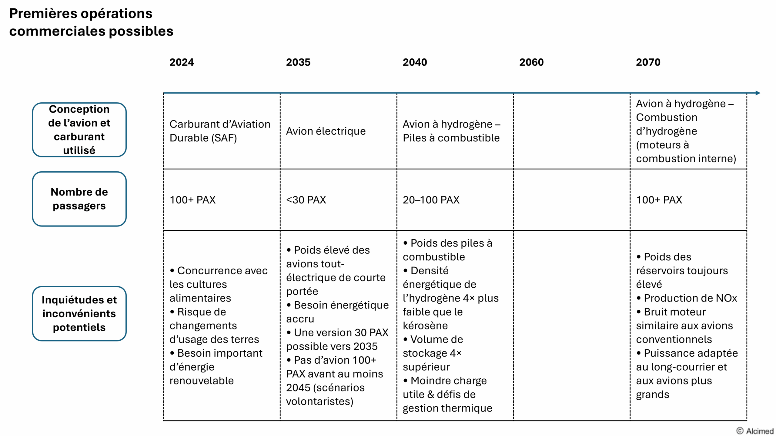 Aujourd’hui, les catégories d’aéronefs en cours de conception et les carburants utilisés couvrent l’ensemble des segments actuels de l’aviation. Ils répondent aux besoins de capacité allant de moins de 30 passagers à plus de 100, ainsi qu’à des gammes variées du court-courrier au long-courrier.
